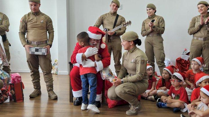 Os cadetes entregaram presentes, participaram de atividades recreativas e brincadeiras, criando um ambiente acolhedor e divertido. Esta ação integra as atividades sociais da Polícia Militar de Santa Catarina (PMSC), visando fortalecer os laços com a comunidade e promover valores de cidadania e fraternidade, especialmente neste período natalino.