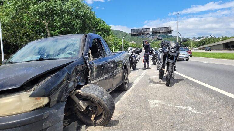 Na manhã desta quinta-feira (5), um acidente envolvendo um caminhão e um carro causou transtornos para quem seguia em direção ao Norte da Ilha, em Florianópolis. A colisão aconteceu na Avenida da Saudade, embaixo do Elevado do Itacorubi, resultando em congestionamento. De acordo com a Guarda Municipal, o incidente foi considerado uma forte colisão, porém sem vítimas feridas. O acidente envolveu um caminhão e um veículo VW Saveiro, que teve danos consideráveis em sua lateral, incluindo o deslocamento de um dos pneus.