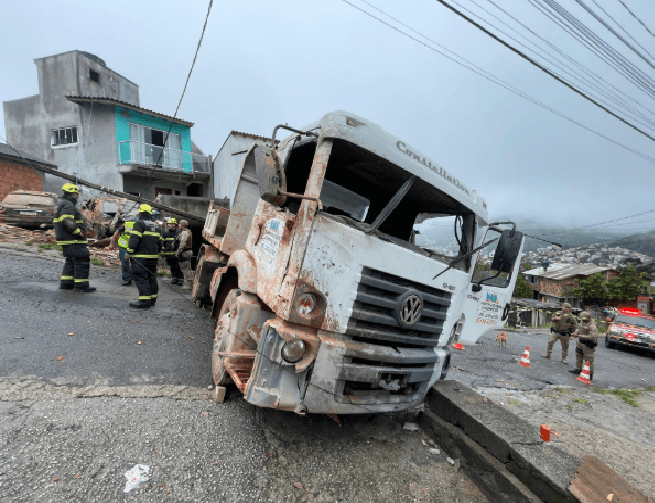 Um grave acidente na manhã desta quarta-feira (29) deixou um rastro de destruição na Transcaeira, no Alto da Caeira, região central de Florianópolis. Um caminhão caçamba perdeu o controle na descida e atingiu casas, muros, motos e veículos. O impacto foi tão forte que um dos imóveis chegou a ser parcialmente destruído antes do veículo capotar. Dois homens ficaram feridos, incluindo o motorista do caminhão. Equipes do Corpo de Bombeiros atuam no socorro às vítimas e na contenção dos estragos.