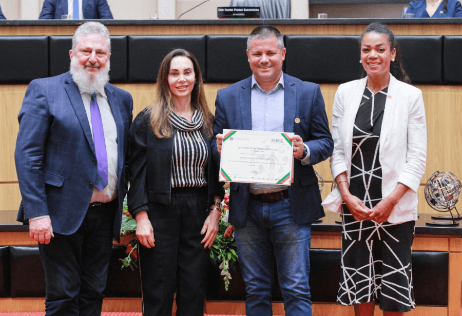 O Grupo Nexxees foi homenageado com o Certificado de Responsabilidade Social de Santa Catarina 2024, em uma sessão especial realizada no Plenário Deputado Osni Régis, na Assembleia Legislativa de Santa Catarina (ALESC), no último dia 2 de dezembro. Representado pelo diretor-executivo Rodrigo Clemente, o Grupo também conquistou, pela sexta vez, o Troféu Responsabilidade Social – Destaque SC, na categoria Comércio, Serviço e Turismo de Grande Porte.