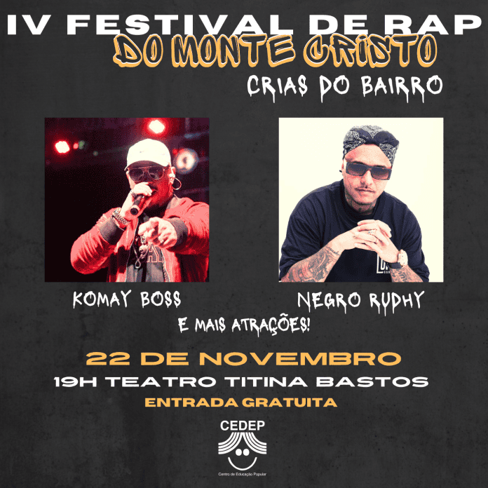 O CEDEP será palco do IV Festival de Rap, um evento imperdível que promete celebrar a cultura do rap em Florianópolis e Santa Catarina. Com início às 19h no Teatro Titina Bastos, localizado na rua Frei Fabiano de Cristo, s/n, no Monte Cristo, o festival contará com a presença dos renomados rappers Negro Rudhy e Komay Boss, grandes ícones da cena local. Além disso, as Crias do Monte Cristo estarão se apresentando, evidenciando a continuidade e vitalidade do rap nas comunidades da região.