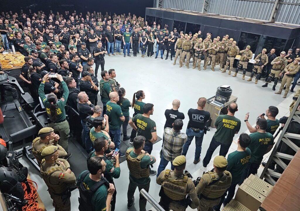 A ação conta com a atuação de 423 agentes de segurança pública, incluindo membros do Ministério Público de Santa Catarina, GAECO de Santa Catarina e Paraná, policiais civis e militares, bombeiros, guardas municipais e cães farejadores. Uma aeronave do SAERFRON da Polícia Civil e 146 viaturas estão sendo empregadas nas diligências.