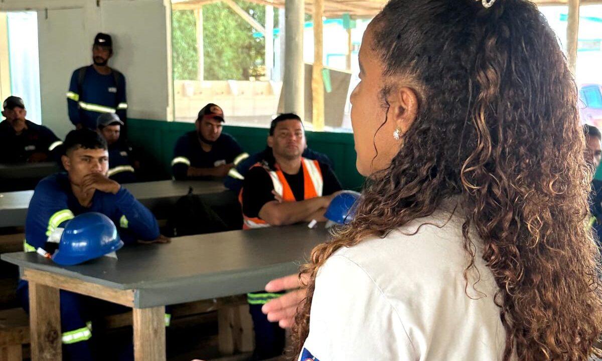 Participação de mais de 100 trabalhadores da ETE Potecas em palestra sobre prevenção à dengue durante Diálogo Diário de Segurança. Conscientização sobre riscos, sintomas e cuidados.